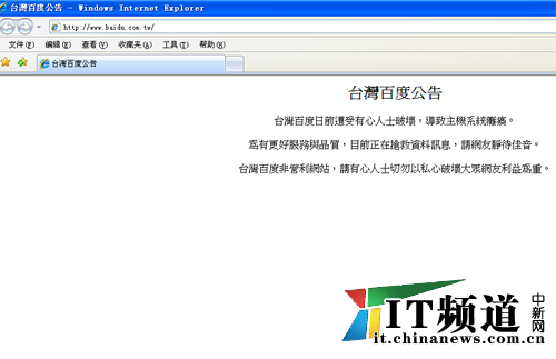 臺灣百度發(fā)布的公告稱:“臺灣百度日前遭受有心人士破壞,導(dǎo)致主機(jī)系統(tǒng)癱瘓。為有更好服務(wù)與質(zhì)量,目前正在搶救數(shù)據(jù)訊息,請網(wǎng)友靜待佳音。臺灣百度非營利網(wǎng)站,請有心人士切勿以私心破壞大眾網(wǎng)友利益為重!