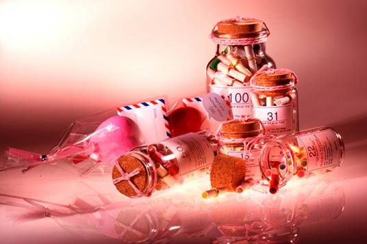 這就是很有人氣、創(chuàng)意兼可愛的情書膠囊,號稱用整瓶甜蜜的膠囊,道出永遠(yuǎn)愛你的理由,補充關(guān)懷、補充愛!玄機在哪里?打開它試試看吧!原來每個膠囊里面都藏有一個空白小紙條,用來寫下對愛人想要說的話,寫好后把它卷起來用膠囊里精致的金屬小環(huán)套住再放回去。如此炮制一周用量的愛,當(dāng)然,只要你的情話源源不絕,那么預(yù)約一整年的愛意表達(dá)也很不錯。寫好后,趕快把它們交給專屬你的“病號”,記得要叮囑對方每日服用,相信沒有誰可以抵抗得了這份浪漫,發(fā)現(xiàn)秘密后得到的意外驚喜一定會讓其感動良久。