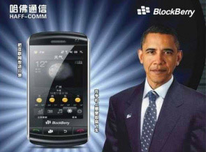 據(jù)美國媒體報道,日前,美國總統(tǒng)巴拉克奧巴馬的形象出現(xiàn)在中國一款仿黑莓BlackBerry Storm 9500手機的宣傳海報上。