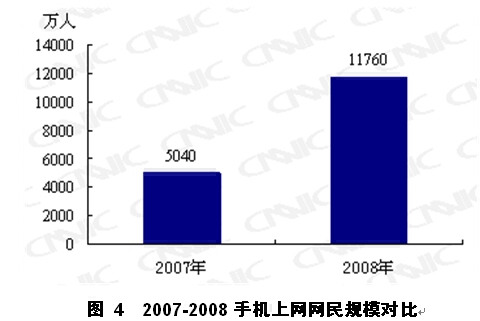 中國互聯(lián)網(wǎng)絡(luò)信息中心(CNNIC)今天下午在京發(fā)布的《第23次中國互聯(lián)網(wǎng)絡(luò)發(fā)展?fàn)顩r統(tǒng)計報告》透露,截至2008年,使用手機上網(wǎng)的網(wǎng)民達到1.176億人,較2007年增長一倍多。