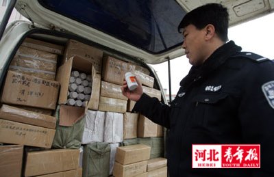 3月1日1時(shí)許,一輛河南牌照的金杯面包車駛?cè)敫咚俳痪咭卮箨?duì)負(fù)責(zé)的分流點(diǎn)。民警靳懷富發(fā)現(xiàn)該面包車車窗被黑布遮擋著,十分可疑,便示意停車接受檢查。司機(jī)取駕駛本時(shí)神情慌張。靳懷富看到車?yán)镆脖缓诓颊趽,掀起查看原來是一些紙箱?table border=0 cellspacing=0 cellpadding=0 align=left>