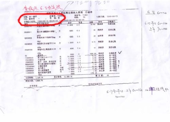 第一份清單是她母親席桂芬的。席桂芬今年80歲,是南陽(yáng)市商業(yè)局的離退休干部,多年來(lái)患有高血壓、糖尿病、老年癡呆癥等,近年來(lái)經(jīng)常在南陽(yáng)市第三人民醫(yī)院住院治療。清單顯示的時(shí)間為“2007年10月29日至30日(前日零點(diǎn)至次日零點(diǎn),下同)”,李冰特意在兩行費(fèi)用上用紅筆作了標(biāo)記:一次性用品,單價(jià)10元,套數(shù)258套,合計(jì)金額2580元,類(lèi)別為其他費(fèi)用。也就是說(shuō),在醫(yī)療費(fèi)用之外,席桂芬這一天揮霍掉了258套一次性用品。第二份清單上,時(shí)間為:2008年6月14日,其母親的性別變成了“男”。