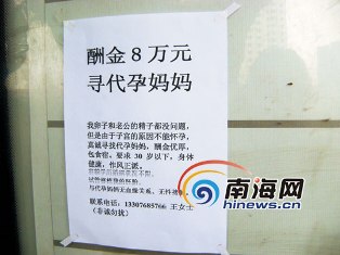 今天下午4點(diǎn)許,南國都市報(bào)記者來到?谑泻8菲嚃|站對(duì)面的公交車站看到,在站牌上貼有2張代孕廣告,廣告大致內(nèi)容如下:“酬金8萬元找代孕媽媽”,因自己子宮問題不能生育,真誠尋找“代孕媽媽”,酬金優(yōu)厚,包食宿,要求對(duì)方年齡30歲以下,身體健康,作風(fēng)正派。聯(lián)系人為王女士,手機(jī)號(hào)碼13307685###。