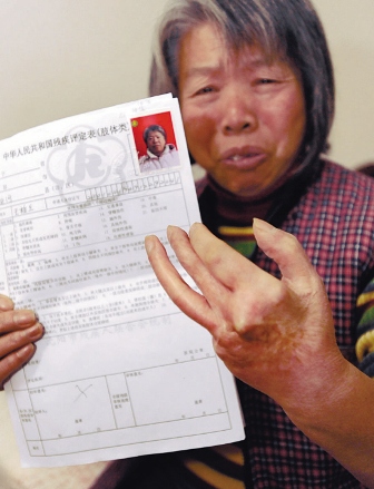 記者看到王桂蘭提供的殘疾證上注明,王桂蘭為三級(jí)肢體殘疾,頒證日期為2002年10月23日。而在最新“中華人民共和國殘疾評(píng)定標(biāo)準(zhǔn)表(肢體類)”上,記者看到新評(píng)定標(biāo)準(zhǔn):“……雙手拇指或雙手拇指以外其他手指全缺失”可為三級(jí)肢殘,……單手拇指以外其他四指全缺失”可為四級(jí)肢殘。而王桂蘭的左手雖然嚴(yán)重變形,但是還有四個(gè)手指頭,按照這個(gè)標(biāo)準(zhǔn),王桂蘭的確不能算是殘疾。