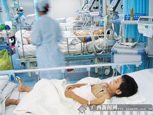 6月23日下午2時(shí),記者趕到貴港市人民醫(yī)院時(shí),正遇見自治區(qū)衛(wèi)生廳、教育廳的領(lǐng)導(dǎo)前來看望中毒的幼兒。在醫(yī)院外科樓二樓的重癥監(jiān)護(hù)室內(nèi),5名幼兒正在接受救治,其中3名病情較重。一名看起來只有四五歲的小孩口鼻插著導(dǎo)管,躺在床上不停地抽搐。醫(yī)生告訴記者,這名幼兒身體素質(zhì)較差,被送到醫(yī)院搶救后出現(xiàn)了血尿、高燒、肺水腫等癥狀,有病情加重的趨勢(shì)。后來,經(jīng)過搶救,病情得到緩解。