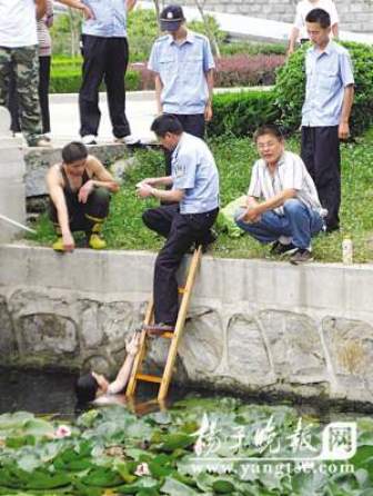 女子與眾人僵持了半個小時后,一位民警無意中與其提到“錢”,該女子突然表現(xiàn)出極大的興趣:“你給我錢,我就上去!泵窬统鰞蓮埌僭筲n在岸上晃了晃,哄道:“先上來,上來我就給你!痹诒娙说膭裾f和鈔票的吸引下,該女子終于同意穿上衣服上岸。在上岸之前,她還從河中摘了一朵蓮花獻給警察,以示“感謝”。據(jù)悉,該女子姓孫,35歲,11年前,因戀愛問題,患上狂躁癥,先后多次被送到精神病院治療。(紹平 萬春 李根 小川)
