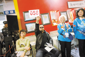 2008元的起拍價很快被1萬、3萬的喊聲淹沒下去。33號競買者仿佛志在必得,一下子喊出了5萬元的價格?珊笈乓晃淮髂R的青年男子根本沒有松口,一下子跟到7萬。33號喊“8萬”,“墨鏡”喊8.8萬。嘩、嘩、嘩……無論是競買者還是觀眾,再次為他們的愛心鼓起掌來。