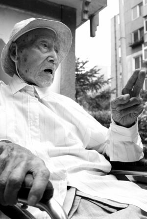 老人最喜歡吃的食品有牛奶、雞蛋、地瓜、香蕉、餃子、紅燒肉等。他從年輕時候起飯量就不大,從不暴飲暴食,現(xiàn)在每餐也只吃七八分飽,最喜歡的紅燒肉和餃子,也只吃五六口。社區(qū)醫(yī)院每月都來給老人檢查身體,老人各項指標均正常,沒住過醫(yī)院,感冒發(fā)燒都極少。前幾天高溫,老人患了肺內感染,也只打了3天吊瓶,多打一天他都不讓,而且堅決不吃藥,他說“是藥三分毒”。老人滿口假牙,吃飯時飯菜必須軟爛;眼睛有些花,報紙上的大字還能看清;一只耳朵失聰,另一只耳朵有點背,跟他說話得大點兒聲。