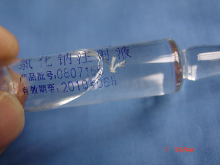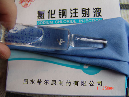 平頂山市新華區(qū)人民醫(yī)院秦大夫向記者介紹說,2008年11月5日,他正在給患者進(jìn)行特殊治療時,發(fā)現(xiàn)注射用的0.9%氯化鈉注射液內(nèi)有較大異物且肉眼可見,形狀約像一只蚊子(如圖),該藥品批號為0807165,生產(chǎn)廠家是山東省泗水希爾康制藥有限公司。