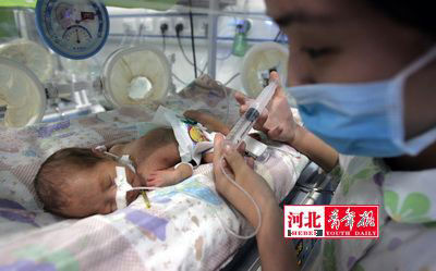 昨日,記者在醫(yī)院的新生兒監(jiān)護病房看到,三個小男孩兒都躺在保溫箱里。據(jù)兒科醫(yī)生介紹,三個孩子都是低體重早產(chǎn)兒,出生時孕周為33周多。老大是1.58公斤,老二和老三是1.55公斤,自3月16日出生到現(xiàn)在已經(jīng)度過了呼吸關(guān),還有感染關(guān)、喂養(yǎng)關(guān)、黃疸關(guān)在等待著他們。這兩天護士已經(jīng)開始通過鼻飼管注射給他們喂奶了,三個孩子每次分別給注射7毫升、3毫升和4毫升,2個小時喂一次。從目前來看,除老大有點貧血外,三個孩子心肺功能腦部發(fā)育都很好,預(yù)計還有2到3周孩子們才能出保溫箱。