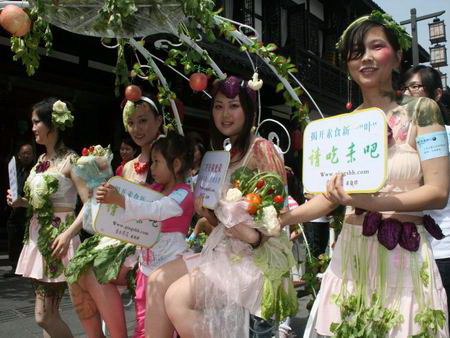 當(dāng)天正值第四十個(gè)世界地球日,成都文殊坊街上人流熙攘。這幫身披菜葉的年輕漂亮女子馬上就成為行人注目的焦點(diǎn),“喲,遠(yuǎn)看就只掛了些菜葉子在身上,原來(lái)還是穿了點(diǎn)紗的嘛,是不是又在搞什么商業(yè)活動(dòng)哦?”四川新聞網(wǎng)記者在現(xiàn)場(chǎng)看到,雖然沒(méi)怎么搞清楚狀況,但不少市民已經(jīng)掏出手機(jī)來(lái)開(kāi)始拍照。得知是群素食主義者的宣傳活動(dòng)后不少市民都打趣稱(chēng),“用穿得少的美女上街當(dāng)噱頭,肯定要轟動(dòng)!