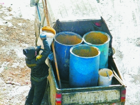 在中三路地窨子附近的老養(yǎng)雞場(chǎng)院內(nèi),有一家比較大的黑加工點(diǎn),該加工點(diǎn)院內(nèi)有兩輛小型貨車,每天外出淘油兩次,薩爾圖區(qū)和高新區(qū)的一些飯店門前馬葫蘆,被他們“承包”。