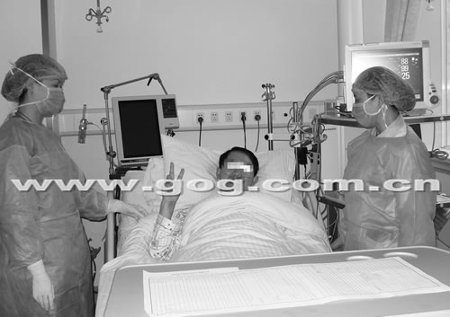 重癥監(jiān)護(hù)病房劉蘭主任醫(yī)師介紹說(shuō),周某剛轉(zhuǎn)到ICU時(shí),出現(xiàn)呼吸衰竭,病情已是危在旦夕,非常嚴(yán)重。醫(yī)護(hù)人員緊急采取搶救措施,對(duì)其進(jìn)行插管,上呼吸機(jī)幫助他呼吸,在插管的過(guò)程中,病人喉管里還有血性盛出液外噴,由于病情危重,上呼吸機(jī)的那天直到第二天早上,周某一直是100%純氧供給,之后才降為90%,80%慢慢下降供氧比例。
