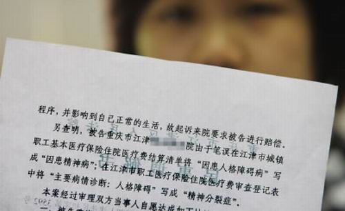 2006年8月18日,小玫在和繼母吵架后被舅舅強(qiáng)行送進(jìn)江津精神康復(fù)院,接受了5天的強(qiáng)制治療。隨后,院方在小玫“職工醫(yī)保費(fèi)用審查登記表”病情診斷一欄中作出了“精神分裂癥和人格障礙”的結(jié)論,小玫說(shuō),這一鑒定讓她此后的生活和感情陷入混亂。她隨后將院方和舅舅告上江津區(qū)人民法院,希望求得清白,并提出6萬(wàn)元的索賠請(qǐng)求。無(wú)奈小玫的案子遲遲沒(méi)有立案,她為此四處奔波兩年,結(jié)果都是徒勞。