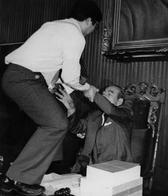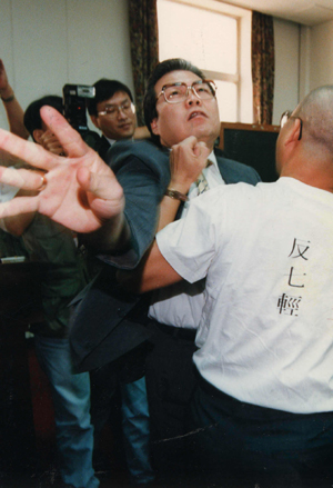當(dāng)朱高正跳上主席臺(tái),議場(chǎng)內(nèi)頓時(shí)像爆發(fā)的活火山,趙少康等人沖上發(fā)言臺(tái),抓住高站在主席臺(tái)上的朱高正的腳踝。后排的“立委”則大喊“上啊!”“打死他,打死他!”,個(gè)個(gè)爭(zhēng)先恐后沖向主席臺(tái)。