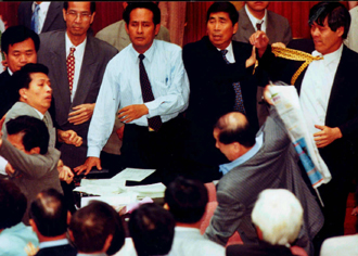 1999年6月15日,“立法院”成了“暴力院”,一整天議事氣氛火爆,從下午到晚間,暴力打人事件頻傳,晚間八點(diǎn)多甚至演出集體暴力場面。無黨籍“立委”羅福助因?yàn)椴粷M民進(jìn)黨杯葛議事,與民進(jìn)黨“立委”發(fā)生沖突而扭打,一時(shí)間包括羅福助兒子羅明才等數(shù)人都加入戰(zhàn)局,現(xiàn)場打成一團(tuán),朝野“立委”多人掛彩。這場暴力打人過程長達(dá)十余分鐘,過程令人怵目驚心。