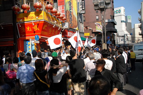 午后1點左右,大概有30人左右自稱前去為池袋做街道清掃,集結(jié)到池袋電車站北口附近的“陽光城”中國物產(chǎn)店門前。這群人手舉著日本國旗,對“陽光城”進行游行抗議。