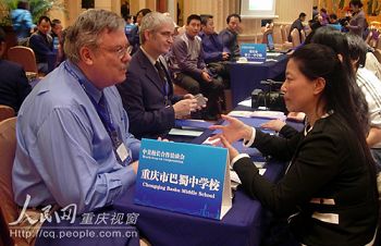 今日(8日)上午,重慶金科大酒店多功能會議廳內(nèi)人頭攢動,重慶多所中小學的校長及教員在各自展位上擺放好宣傳資料,等待有合作意向的美國校長前來洽談。美方的校長們在展位間穿梭,與“相中”的中方學校展開零距離的交流。漢語和英語在會場內(nèi)交替使用,使得這場中美漢語教學合作的“雙選會”氣氛格外熱烈。