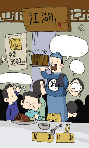 筷子是“雙截棍”,牙簽是“暗器”,特色菜成“獨(dú)門(mén)秘笈”,本市一家飯店玩特色玩進(jìn)“江湖”;蛟S是因?yàn)樘⒅仫埖暄b潢、語(yǔ)言的特色,最主要的菜品種類反倒成了次要的。
