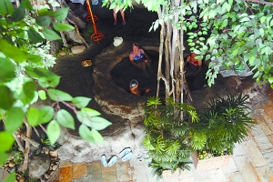 溫泉養(yǎng)生區(qū)的山石、樹根、藤蔓營造出熱帶雨林的幽雅環(huán)境,其中不乏藥池以及石質(zhì)的按摩床,同時,還引入了死海漂浮、親親魚療等自費項目。泡乏了,可以到二樓享受按摩、足療等服務。