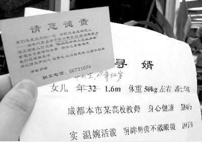 這是一份不同尋常的征婚啟事。它印在名片上。言語中,滿是自責(zé)。文字來自于父母:當(dāng)年只要求孩子學(xué)習(xí)再學(xué)習(xí),努力再努力,而不顧人倫天理,堅(jiān)決反對女兒交往異性,時(shí)至今日雖悔悟自責(zé),然女兒青春難再……