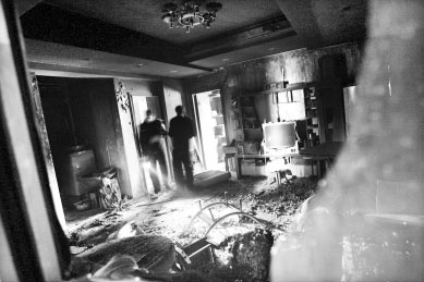 昨日上午9時(shí)30分許,記者在火災(zāi)現(xiàn)場(chǎng)看到,房屋客廳內(nèi)一片狼籍,地板、沙發(fā)、電視機(jī)等都被燒毀,窗戶被撬開(kāi),墻壁都被熏黑了,門前有一個(gè)使用過(guò)的滅火器。 民警、消防人員正在勘查現(xiàn)場(chǎng)。