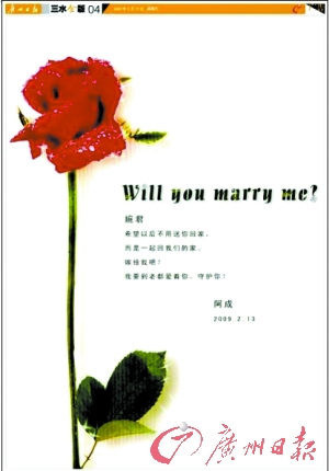 “婉君,Will you marry me?希望以后不用送你回家,而是一起回我們的家?——阿成”,為了趕在情人節(jié)前送女友一個(gè)難忘的感動(dòng),昨日,三水一位署名“阿成”的市民在本報(bào)三水金版上刊登整版求婚廣告,引起全城關(guān)注,求婚宣言讓許多市民大嘆“浪漫”,也好奇求婚記是否完美收?qǐng)?記者找到了求婚者阿成和女主角婉君,還原甜蜜回憶。
