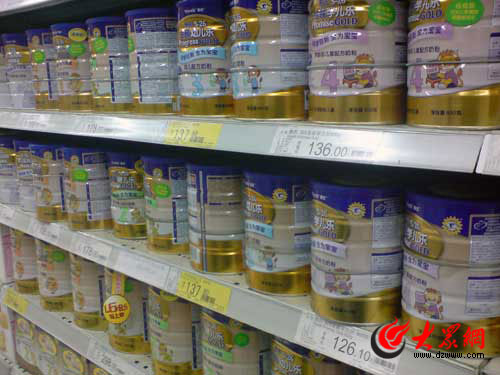 24日上午,記者在大潤(rùn)發(fā)歷下店和濟(jì)南銀座商城的奶粉柜臺(tái)看到,惠氏奶粉仍然擺在貨架上,價(jià)格也未發(fā) 生變化;而在家樂(lè)福超市,記者看到惠氏奶粉已經(jīng)被擺上了促銷柜臺(tái)的顯著位置,記者注意到,惠氏2段S26金 裝健兒樂(lè)900克聽(tīng)裝奶粉當(dāng)天售價(jià)仍然是178元,而惠氏3段S26金裝健兒樂(lè)900克聽(tīng)裝奶粉售價(jià)已從155.8元直降 到137.8元,降幅達(dá)到18元。銷售人員告訴記者,惠氏被曝光的事她已經(jīng)知道,但并未接到下架通知,盡管她表示惠氏降價(jià)與“結(jié)石門”無(wú)關(guān),但記者從價(jià)格標(biāo)簽上看到,降價(jià)銷售的標(biāo)簽是24日當(dāng)天新?lián)Q的;在沃爾瑪超市,記者看到惠氏同樣在降價(jià)促銷,降幅與家樂(lè)福相同。