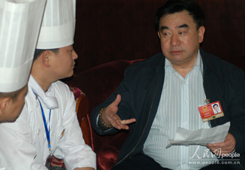 全國人大代表、湘菜大師許菊云與酒店大廚在進行交流。人民網(wǎng)記者 李昉 攝 人民網(wǎng)北京3月3日電 (記者 李昉) 食品安全事故的發(fā)生,在一定程度上對消費者造成恐慌,讓民眾對食品安全產(chǎn)生信任危機,這也成為了今年兩會廣泛關(guān)注的話題之一。那么,如何才能堵住食品安全生產(chǎn)漏洞呢?全國人大代表、湘菜大師許菊云建議嚴把源頭、餐桌、意識三道關(guān)。