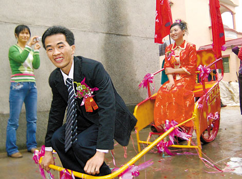 當(dāng)日下午2時左右,石頭村接龍橋到慈灣村的小道上,鞭炮齊鳴,笑聲不斷。西裝革履的新郎正奮力拉著一輛自制的兩輪人力車,人力車上端坐著漂亮的新娘,紅彤彤的禮服映紅了新娘的臉。新郎是棠下鎮(zhèn)石頭村委會慈灣村人,在棠下工業(yè)區(qū)的一車廂廠工作,新娘是環(huán)市街道辦丹灶村人,兩人已經(jīng)相識一年,當(dāng)日喜結(jié)良緣。