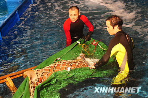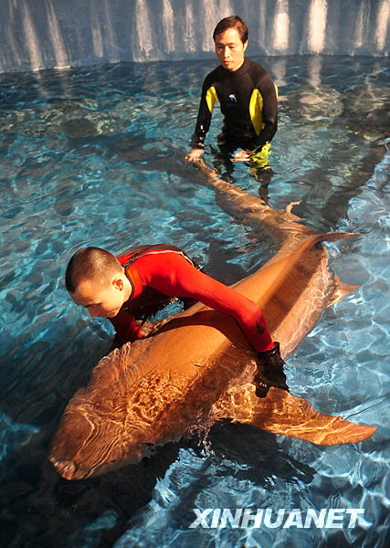 當日晚,廣東省漁政部門從廣州一家酒樓解救出一條護士鯊,并將其送到廣東省水生野生動物救護基地。據悉,此護士鯊為廣州某酒樓從水產市場購得,在酒樓水族箱里展示,接受食客們的預定。環(huán)保人士獲知后前往酒樓抗議護鯊,漁政部門隨即前往酒樓將其救出。護士鯊屬于廣東省野生保護動物,受到廣東地方保護法保護。新華社記者 盧漢欣 攝