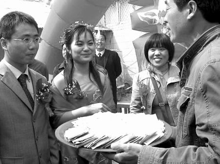 楊宏偉告訴記者,相對于形式,他更看重的是內涵!艾F(xiàn)在的婚禮往往想方設法請來眾多高級轎車,然后在豪華賓館擺上若干桌酒席,請親朋好友來吃一頓,既鋪張浪費又沒多大意義,還不如辦得簡單些,用節(jié)約下來的錢做些更有意義的事!睏詈陚フf,他將這個想法告訴妻子和父母后,得到他們的支持。