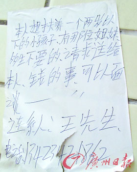 昨日下午,在深圳光明新區(qū)公明辦事處上村社區(qū),記者竟然在一棟樓的墻壁上看見一張買小孩的廣告(見左圖)。這是一張用圓珠筆寫成的廣告,署名為王先生的人稱自己想收養(yǎng)一個(gè)兩歲以下的孩子,請(qǐng)有多生孩子的姐妹送給自己一個(gè),價(jià)錢可以面談。按照廣告上留的電話,記者撥打過去。接電話的女子稱自己和老公結(jié)婚多年未孕,想收養(yǎng)一個(gè)孩子,只好寫了小廣告貼在墻上,希望找到合適的孩子。民政部門的負(fù)責(zé)人表示,這種街頭廣告收養(yǎng)小孩的方式顯然是不合法的,并提醒市民千萬不要上當(dāng)受騙。(記者 阮曉光攝)