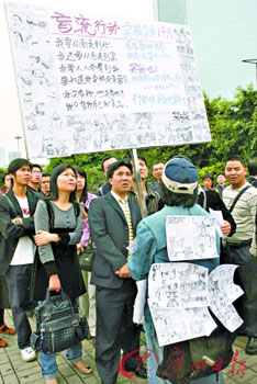 漫畫家名為黃達(dá)沖,在天河體育中心南門廣場舉著一面與他身高差不多的鐵牌,上面展示了他的“三國英雄前傳”漫畫以及他的宣言:“盲流行動·賣稿賣身一千萬……”他一身牛仔套裝上前身后背也貼著多張漫畫作品,引得路人圍觀。何謂“盲流”?他解釋道,他是南寧人,來廣州十年,做過出版和媒體工作,現(xiàn)在快40歲了,還沒找到方向,所以認(rèn)為自己是盲流!拔胰ツ11月開始創(chuàng)作‘三國英雄前傳’,現(xiàn)在完成了一半,今天來到這里想找人投資。如果有誠意的話,私下談價錢……一千萬嘛,不一定是人民幣!痹谂赃呥有一位長發(fā)壯漢,是黃達(dá)沖的“哥們”,也是一位“自由藝術(shù)家”,正幫著他派傳單。