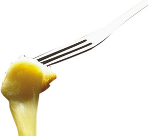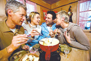 “奶酪火鍋”是瑞士最普遍、最具盛名的火鍋之一。瑞士人制作“奶酪火鍋”一般都是先以蒜涂抹于鍋底,再將不同口味的硬奶酪擦成碎末放入鍋中加熱成糊狀,再加淀粉、白葡萄酒、大蒜、奶油等,繼續(xù)煮并慢慢攪拌至完全融化呈濃濃的煉乳狀,最后放進(jìn)一些黑胡椒即可。上桌后,人們用長(zhǎng)柄叉子叉著切成四五厘米見(jiàn)方的“法式長(zhǎng)棍面包”蘸著奶酪吃,很像中國(guó)的“拔絲香蕉”。此外,吃這種火鍋時(shí),瑞士人還特別喜歡配上有助于清口的風(fēng)干牛肉、腌酸黃瓜、小洋蔥。不過(guò),吃這種火鍋一定要“點(diǎn)到為止”,雖然奶酪富于營(yíng)養(yǎng),但很難消化,用白葡萄酒融化奶酪,就是為了幫助消化!