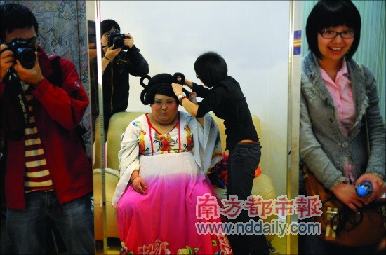 光梳妝打扮,林思思花了一個多小時。盤上發(fā)髻,插上金簪,披起拖地長裙,秋波流轉(zhuǎn),“我漂亮嗎?”沒人敢否認(rèn),歷練多年后,這個28歲的重慶小伙反串楊貴妃頗有一手。他卻要折騰,昨日,他來到深圳和鵬程醫(yī)院一同面對媒體,宣布將接受整形,今后以“沈殿霞”形象示人。