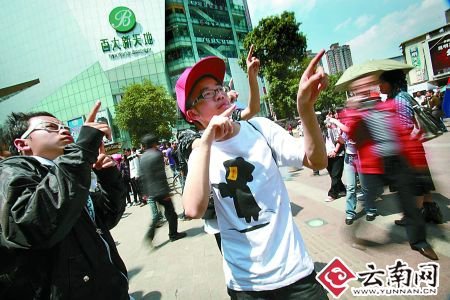 昨天(4月12日)下午1點40分左右,這些年輕人就開始在昆明南屏步行街廣場前聚集,大家三三兩兩地在一起說說笑笑。2點10分左右,突然傳來了一聲哨響,剛剛還在走來走去的人群突然不動了。動作甚至表情都僵硬不變。這一突發(fā)狀況也嚇壞了很多路過的市民,王女士表示:“當我發(fā)現周圍的人都突然不動了的時候,我一下覺得很恐怖,想這是什么陰謀?!”一些老人也非常不理解:“這些年輕人怕是都約好的了,全部在這里擺造型,一個二個表情還多嚴肅,我還以為是出了多大的事,被嚇著了。”