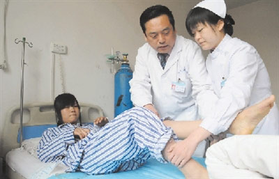 4月11日8時30分,在鄭州大學(xué)神源泌尿研究中心,高曉群教授為阿嬌進(jìn)行了術(shù)前的最后一次檢查,他仔細(xì)地對阿嬌的兩條腿進(jìn)行全面檢查,用術(shù)鉗對著她的腿的每個部位的神經(jīng)進(jìn)行了解和詢問。