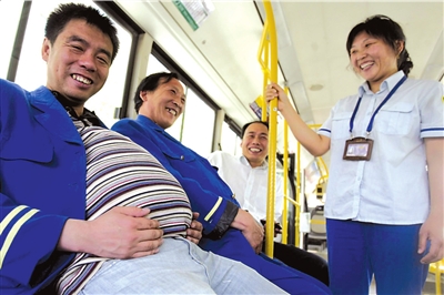 昨天上午,在北京站東街的639公交車(chē)總站內(nèi),突然多了很多“孕婦”集中乘車(chē)。為迎接母親節(jié)的到來(lái),車(chē)隊(duì)讓男司乘人員假扮孕婦,體驗(yàn)當(dāng)母親的辛苦。