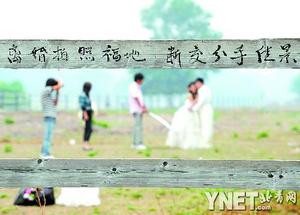 緊鄰的木柵欄上,一對新人在攝影師的指導下趴在上面拍照。不遠處另一對新人則站在了柵欄上面。盡管場地內沒有一匹馬,而且圍欄上寫有如此的警示語,但新人們都無所顧忌地以馬場為背景拍照。有一對新人還和攝影師鉆過木柵欄,進入馬場拍攝。