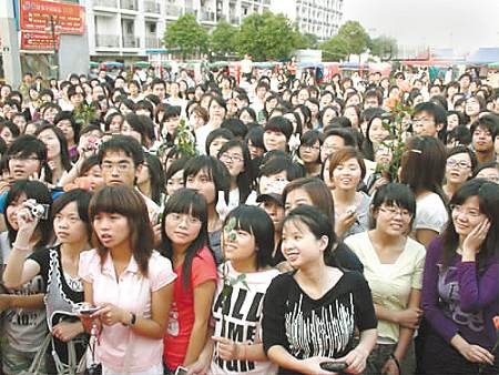 昨天下午,這個(gè)特殊的慶生派對在寧波一所高校北區(qū)宿舍商業(yè)區(qū)的中心廣場上舉行。下午4點(diǎn),光鮮的舞臺(tái)早已搭好,舞臺(tái)上拉著巨幅的噴繪背景,還有樂隊(duì)演奏著歡快的樂曲。