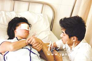 在醫(yī)院眼科搶救病房里,記者昨天下午見到雙眼蒙著紗布、躺在病床上的小雨,她雙手拉住坐在一旁的丈夫不愿松開。據(jù)小雨的丈夫梁偉介紹,他與妻子是在常州打工時(shí)認(rèn)識(shí)的,兩人于2007年年底結(jié)婚,在結(jié)婚前,妻子就知道他有一個(gè)患精神分裂癥的弟弟。