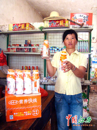 當(dāng)日上午,記者驅(qū)車來到墩上村實地采訪。今年41歲的鄒根枝兒女都在外務(wù)工,和丈夫鄒新海兩人在家?guī)腿搜b殼子板,每天120多元的收入讓兩人很是滿足,平時除了吃飯外還特意買些原料補充營養(yǎng)。鄒根枝介紹說:“6月20日,我從墩上村鄒德水的便利店里買來一箱娃哈哈營養(yǎng)快線,當(dāng)時怕飲料不新鮮,還特意看了生產(chǎn)日期,見是2009年5月31日生產(chǎn)的才放心買了回去,放在家里晚上看電視的時候喝,有些時候我老公(鄒新海)也喝一瓶,但沒有我喝得多。幾天后,我感覺肚子不舒服,上吐下瀉,為此專程搭車到萬年縣石鎮(zhèn)街去買胃藥,花了差不多200元錢病情卻不見好轉(zhuǎn),而且肚子痛得特別厲害。沒有辦法,我只好到屋前的墩上衛(wèi)生所去看病,打了幾天吊針以后病情才有所好轉(zhuǎn)。這次看病不僅花費了近400元醫(yī)藥費,還耽誤了一個多星期沒有干活,就連前兩天插秧都是請人干得,我的損失可大了!