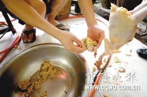 曾經(jīng),雞販給活雞增重,主要方式是手工灌玉米、涼粉、石子和泥巴,市民很容易識破,F(xiàn)在,不良分子將石粉攪成糊狀后,用機(jī)器灌入雞嘴的伎倆已經(jīng)出現(xiàn),市民很容易被麻痹。最瘋狂的灌法,一只雞體內(nèi)石粉可到半公斤。主城市民每天要用土雞的價格,為近一噸的石粉買單。不過,不用緊張,“一摸二看三稱”的辦法可防上當(dāng)。