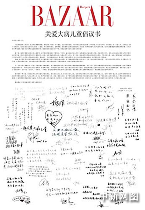 中新網(wǎng)8月10日電 今日,時尚雜志《時尚芭莎》攜手百位明星、名流和企業(yè)家發(fā)起聯(lián)名倡議,呼吁政府相關(guān)部門、各級慈善公益組織,共同關(guān)注中國大病兒童這一弱勢群體的生存、救助問題。同時,《時尚芭莎》宣布將于9月底在京舉行,本屆活動募集的所有善款都將全部捐助給國內(nèi)大病兒童救助公益事業(yè),以此慈善盛舉向偉大祖國六十華誕獻禮。