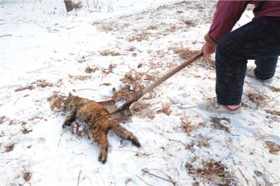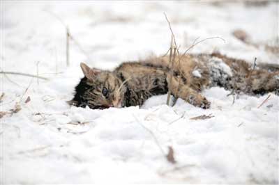 昨天清晨5點(diǎn)多,王阿姨在公園里又發(fā)現(xiàn)了一只被虐殺的流浪貓。王阿姨邊哭邊說,“前天傍晚我剛喂過它,沒想到今天就被人打死了。”這只被虐殺的流浪貓被王阿姨親切地叫做“小灰灰”,它兀自躺在公園東門附近的一處雪地上,腹部被殘忍地剖開,內(nèi)臟和肚腸依稀可見,毛上的血液早已凝固,但它的眼睛卻瞪得大大的。