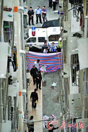 昨天上午11時,記者接到報料后趕往寶安區(qū)民治街道民樂新村。在事發(fā)現(xiàn)場,警方已經(jīng)將133棟樓和134棟樓用警戒線包圍起來。133棟樓共6層,134棟樓共13層,跳樓的女子就摔在兩樓之間2米多寬的小巷里。