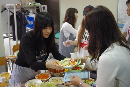 活動(dòng)當(dāng)天一大早,中國(guó)留學(xué)生就已經(jīng)開始了如火如荼的準(zhǔn)備。洗菜、準(zhǔn)備食材、布置會(huì)場(chǎng)……為了能讓來(lái)訪的客人得到最好的體驗(yàn),大家都一絲不茍地進(jìn)行準(zhǔn)備。翼路學(xué)園2號(hào)館4樓主要是各國(guó)風(fēng)味料理的品嘗區(qū)。快到11點(diǎn),整個(gè)樓層彌漫著各種食物的香味。其中的特色食品包括有春卷、餃子、炸醬面還有韓國(guó)冷面等。11點(diǎn)活動(dòng)開始以后各種買賣聲,吆喝聲不絕入耳,非常熱鬧。大家也都排隊(duì)耐心等待自己想要品嘗的食物。2號(hào)館5樓的內(nèi)容比較豐富,有自由交易市場(chǎng),各國(guó)的飲食文化介紹說(shuō)明,中國(guó)的地域文化以及方言的說(shuō)明。在韓國(guó)傳統(tǒng)服飾的展覽區(qū),你不僅可以看到各種彩色的韓國(guó)傳統(tǒng)服飾照片,還能實(shí)際穿上這些學(xué)生帶來(lái)的傳統(tǒng)韓國(guó)服飾,拍下照片,留下紀(jì)念。在表演日本的傳統(tǒng)節(jié)目“落語(yǔ)”時(shí),大家都聚精會(huì)神地聽(tīng)著臺(tái)上繪聲繪色的演出。