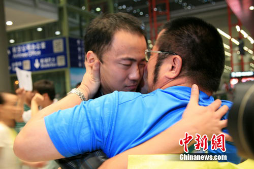 10日晚間,自湖南益陽抵京的翟田田的父親翟泰山及在京親友近十人,到北京首都國際機(jī)場接機(jī)。當(dāng)?shù)蕴锾飻y帶簡易手提袋走出機(jī)場抵達(dá)大廳時(shí),已8年未曾謀面的父子二人相擁而泣。(完)