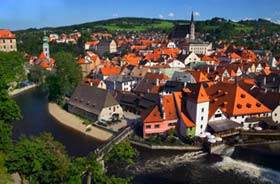 克魯姆洛夫距離首都布拉格160公里,1992年被聯(lián)合國教科文組織列為世界文化遺產(chǎn)。從布拉格搭乘巴士,三個小時就到了。下了車,看著眼前的柏油公路和飛馳而過的汽車,茫然不知如何把眼前的城市景觀和傳說中的童話小鎮(zhèn)聯(lián)系上。跟隨著同車的兩三個背包客,跨過一座橋到了公路對面,瞬時眼前出現(xiàn)了一座暗紅色的磚砌拱門,右前方水聲潺潺,郁郁蔥蔥的樹木后可見一座頗具童話特征的彩繪圓形塔。這一切告訴我,這扇拱門就是通往童話小鎮(zhèn)的入口了。